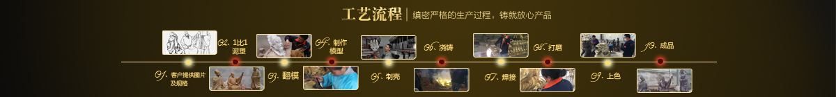 制作一件完美的鑄銅雕塑,最重要的步驟就是制作泥塑模型,然后再用工業(yè)硅膠拓印、翻模。所以泥塑的姿態(tài)、神情生動(dòng)與否直接影響最終銅雕塑的品質(zhì)。所以我廠一直對(duì)泥塑模型的制作格外重視。我廠以雕塑為本,以藝術(shù)為根,挾中華文化之傳統(tǒng),偕歐陸藝術(shù)之風(fēng)韻,風(fēng)格獨(dú)特,盡顯淋漓盡致。我們本著大膽創(chuàng)新、勇于突破的精神,以追求卓越為導(dǎo)向,堅(jiān)持寧缺勿濫為原則,并可依照您提供的要求,為您量身設(shè)計(jì)制作。我廠人才濟(jì)濟(jì),有智慧嚴(yán)謹(jǐn)?shù)墓芾戆嘧?,眾多年輕充滿激情、充滿創(chuàng)意的專業(yè)設(shè)計(jì)團(tuán)隊(duì)、有專業(yè)技術(shù)精湛的雕塑制作人才和專業(yè)的施工隊(duì)伍。他們不僅具深厚的文化藝術(shù)底蘊(yùn),更汲取當(dāng)代雕塑精華,博采眾家之長(zhǎng),作品既有嚴(yán)肅莊重寫(xiě)實(shí)題材,也有輕松前衛(wèi)的抽象題材,表現(xiàn)手法上浪漫主義中不乏樸實(shí),現(xiàn)實(shí)主義中蘊(yùn)涵著激情,設(shè)計(jì)理念貫穿古今、融匯中西,深刻詮釋著藝術(shù)的精髓,把古典主義和后現(xiàn)代主義完美的融合,將雕塑藝術(shù)演繹為力的凝聚、美的體現(xiàn),讓人們感受到的不僅是一種藝術(shù)的浪漫與優(yōu)雅、粗獷與悲壯、更是豐富的優(yōu)秀藝術(shù)寶藏和文化傳統(tǒng),讓您在藝術(shù)與文化中穿流,在時(shí)空中飄蕩,使靈魂在藝術(shù)的海洋洗禮。 MORE+